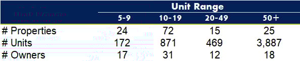 The Richfield multifamily market contains a total of 136 properties and 5,399 total apartment units. These properties are owned by 78 unique ownership groups.